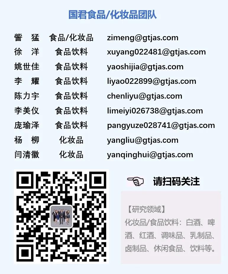 本公众订阅号(微信号: gjretail)为国泰君安证券研究所食品饮料/化妆品研究团队依法设立并运营的微信公众订阅号。本团队负责人訾猛具备证券投资咨询(分析师)执业资格,资格证书编号为S0880513120002。
